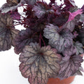 - Heuchera Palace Purple este un exemplar remarcabil cu frunze persistente de aproximativ 15 cm, de culoare roșu-bronz, care rămân atractive pe tot parcursul anului.