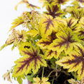 Heuchera Gold Zebra este remarcata pentru toleranța la căldură și umiditate, având un frunzis plin de culoare, galben strălucitor, marcat cu roșu închis.